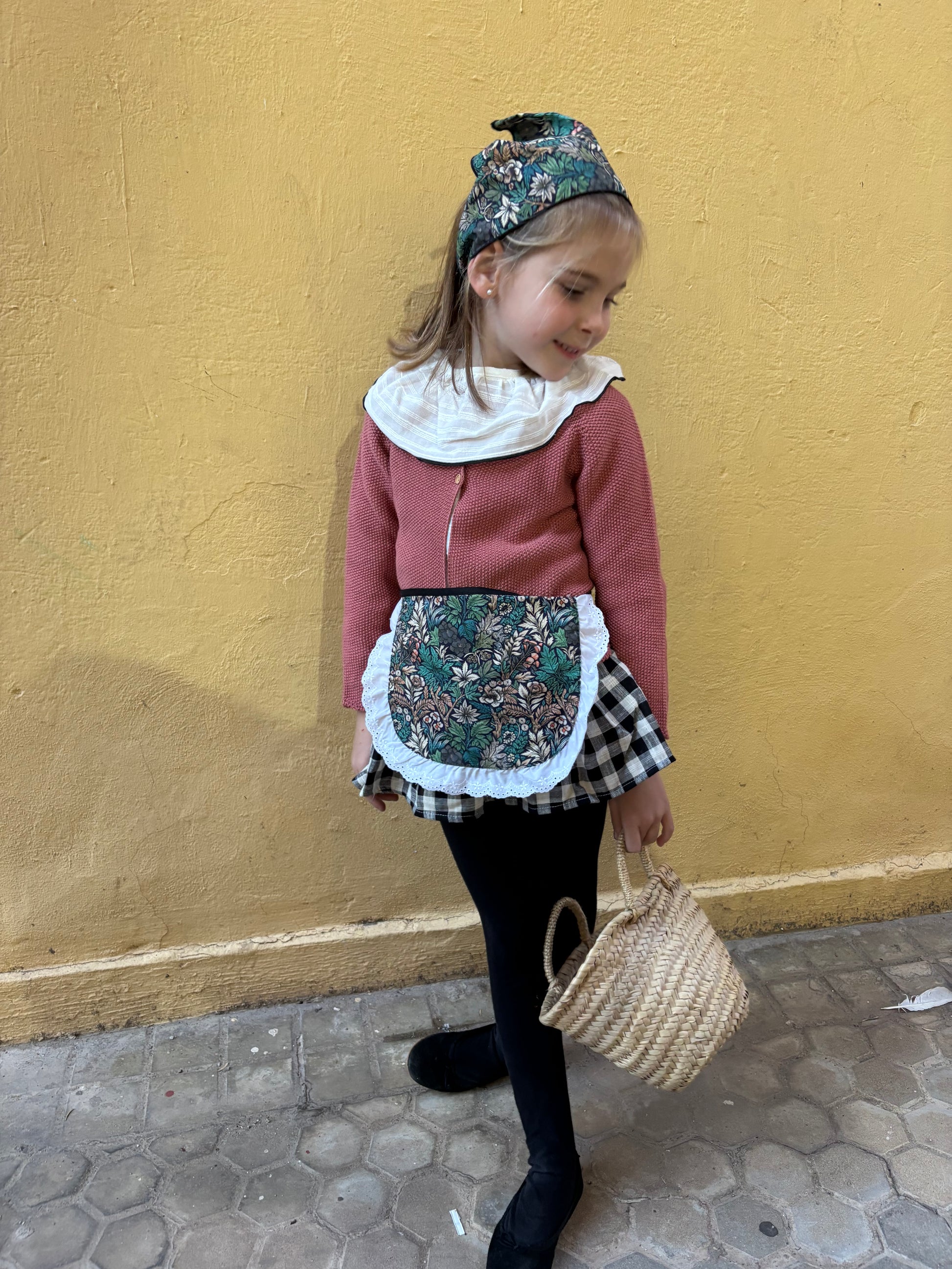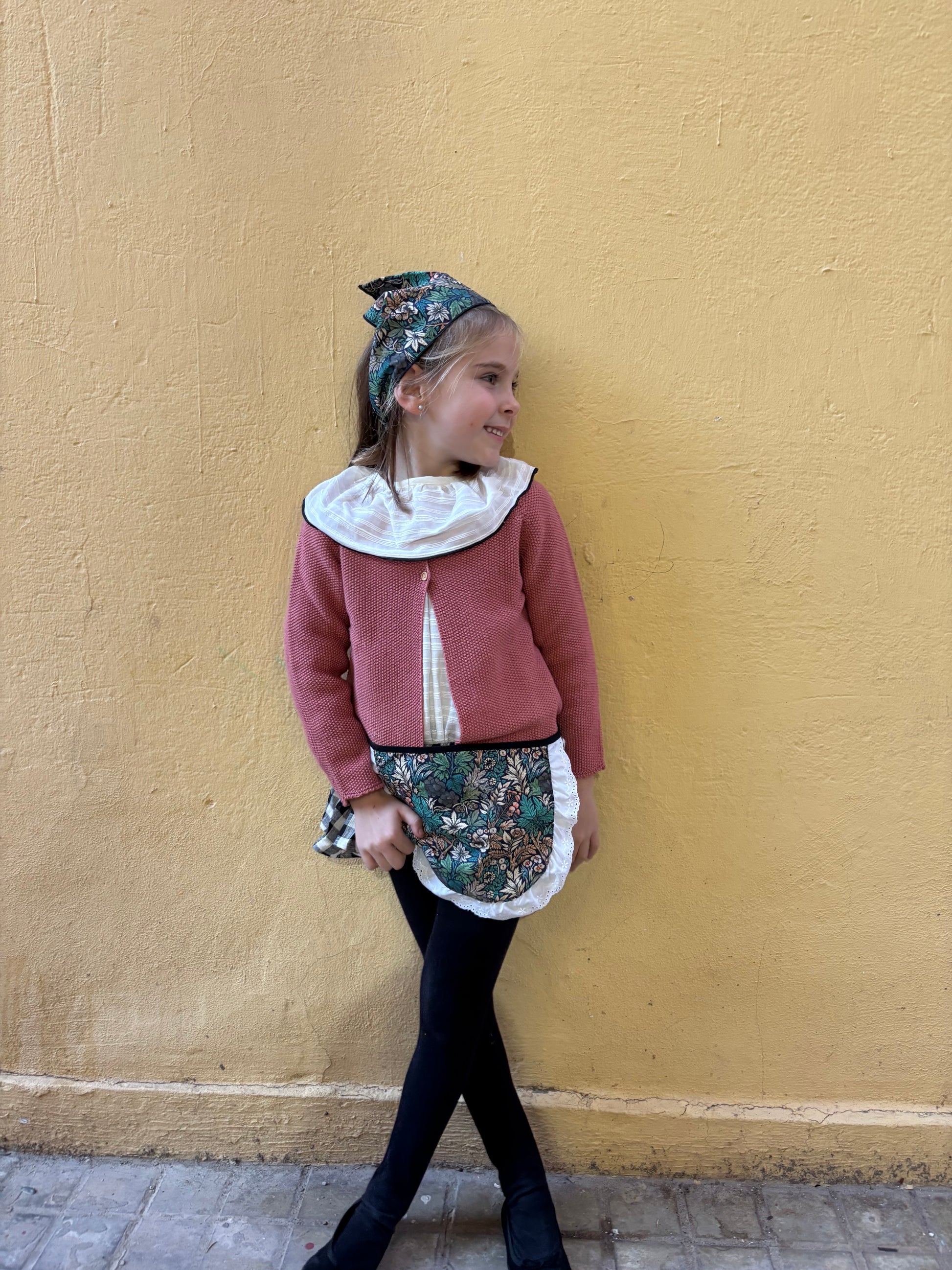 Conjunto de Delantal y pico para pastocita en estampado Iroko. Puede servir desde niñas pequeñas de 12 meses hasta 6 años aprox. (La niña de la foto tiene 6 años)