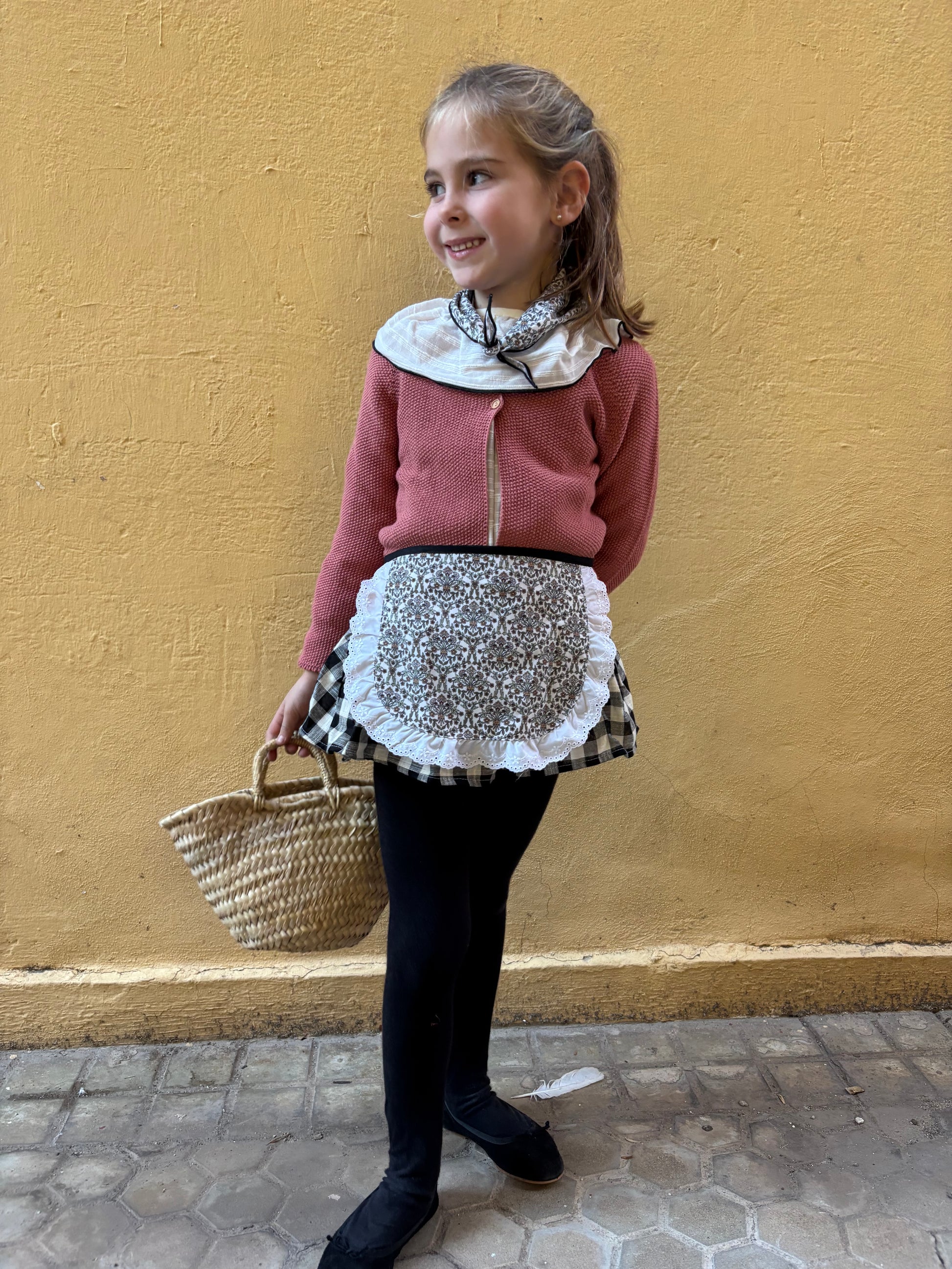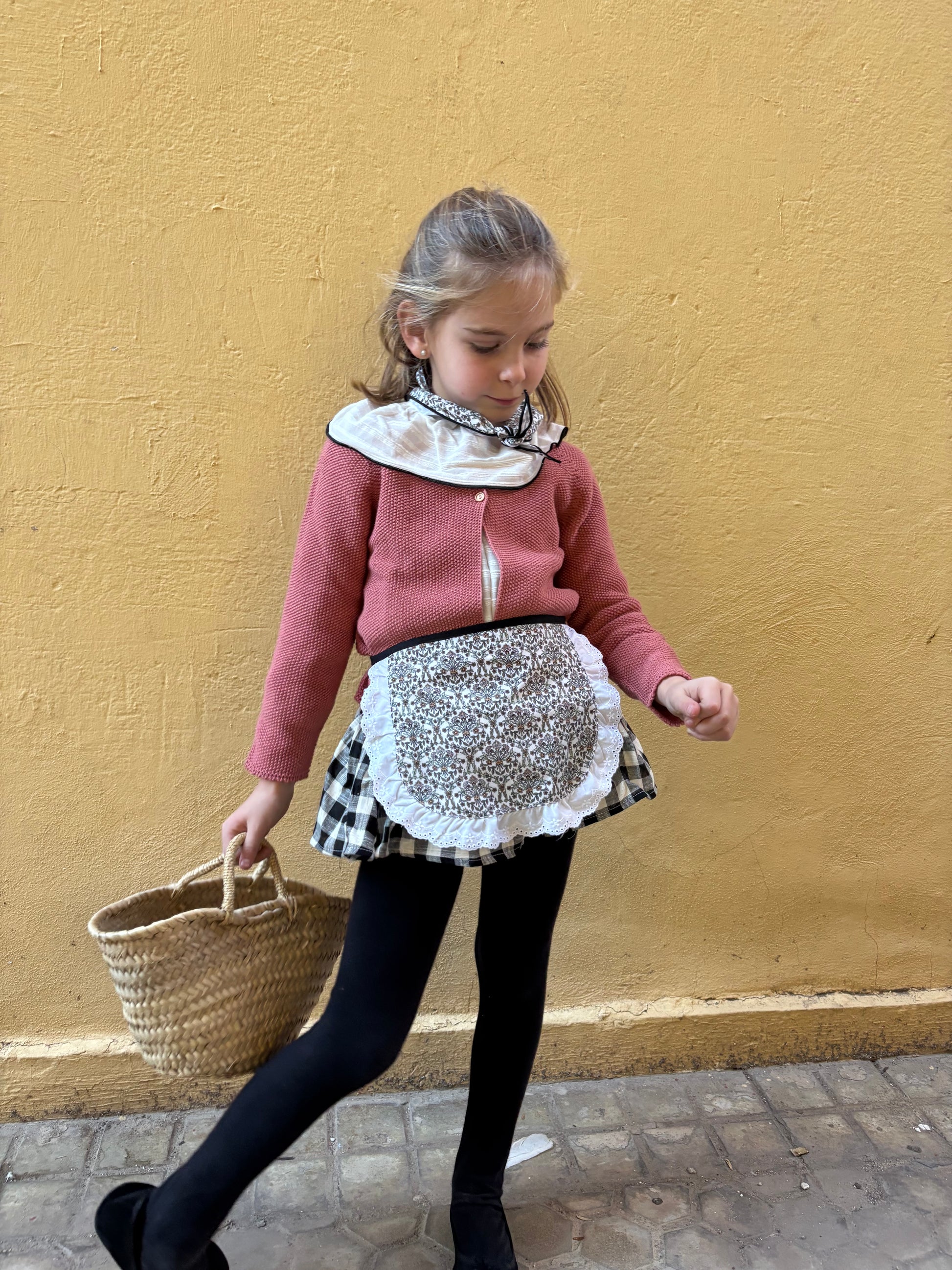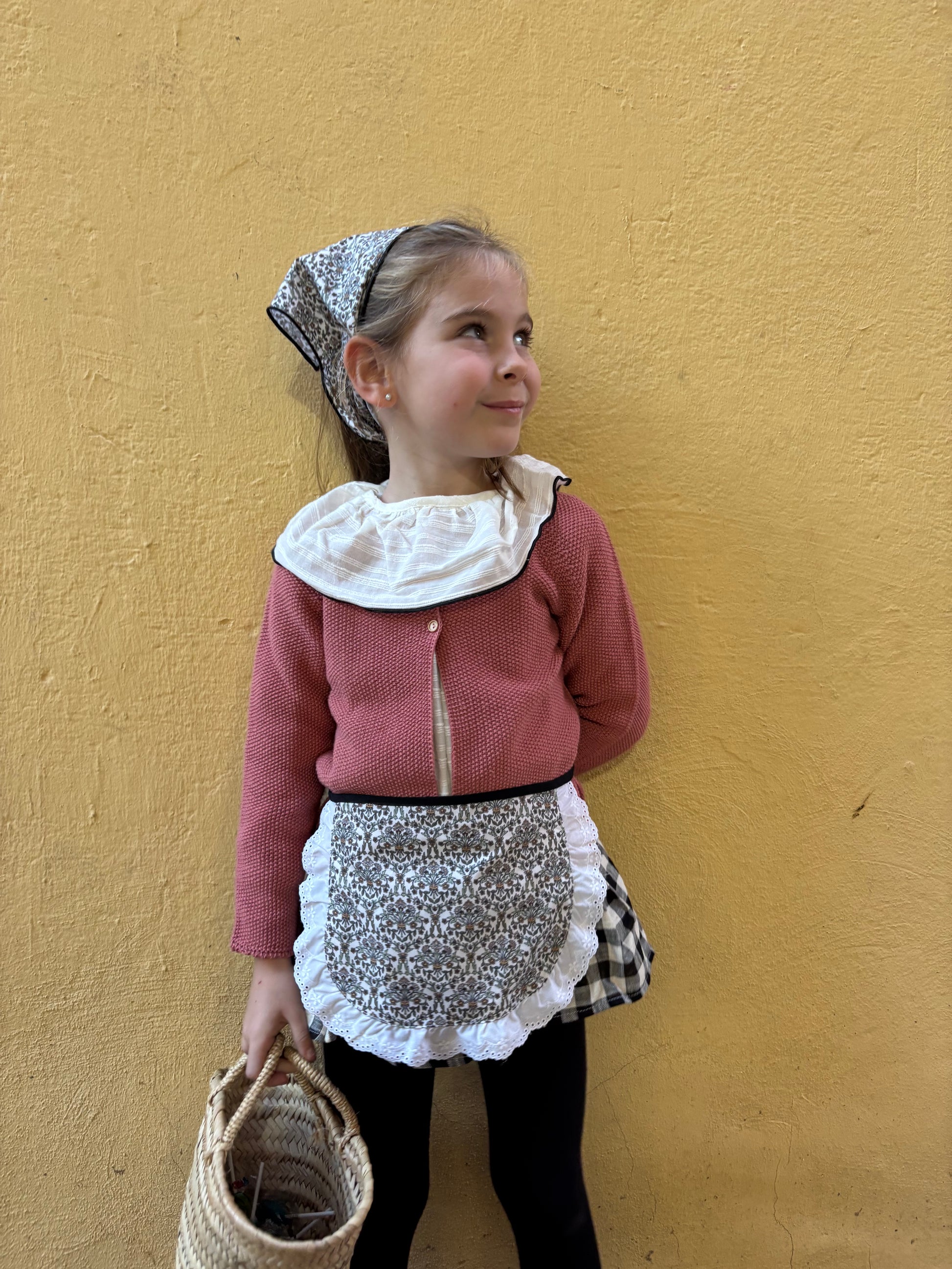 Conjunto de Delantal y pico para pastocita en estampado Moringa. Puede servir desde niñas pequeñas de 12 meses hasta 6 años aprox. (La niña de la foto tiene 6 años)