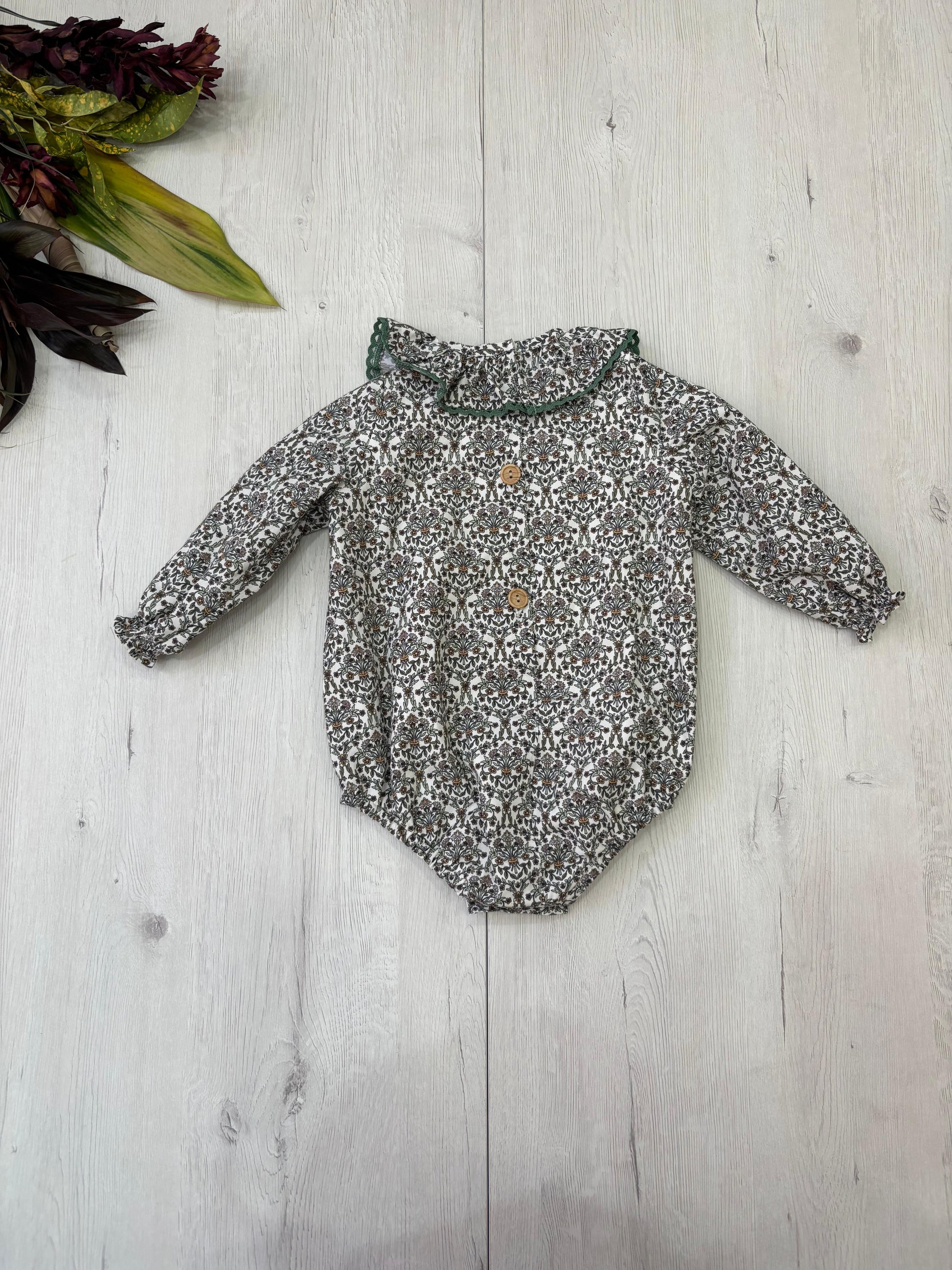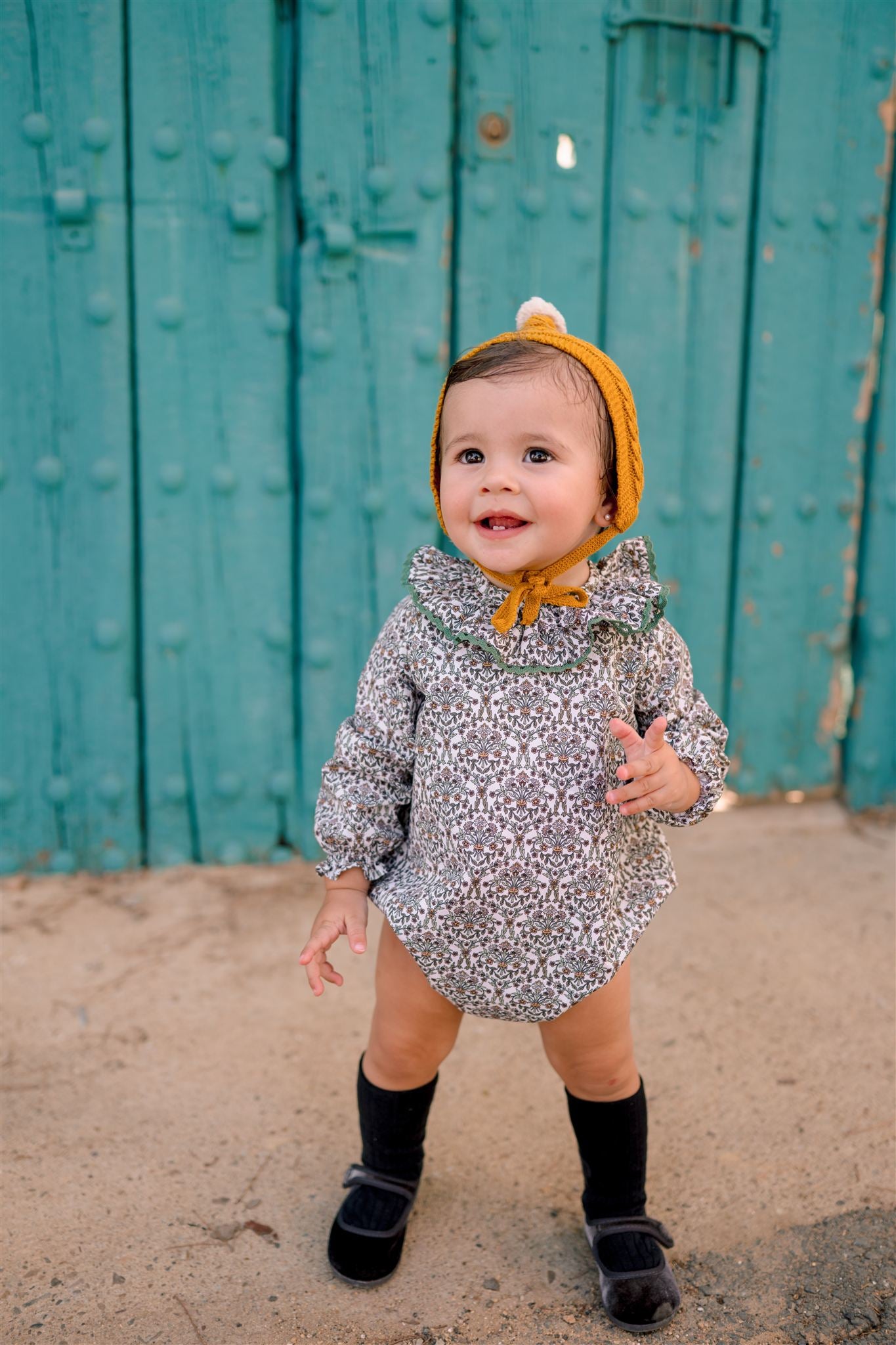 Pelele unisex para los más pequeñitos de la casa, confeccionado en 100% algodón y completamente forrado. El tejido de Moringa está estampado en exclusiva para ILÓ-LILÓ y tiene un colorido muy fino y delicado, fácilmente combinable con nuestros colores de punto. Lleva una tirita bordada en color verde seco.