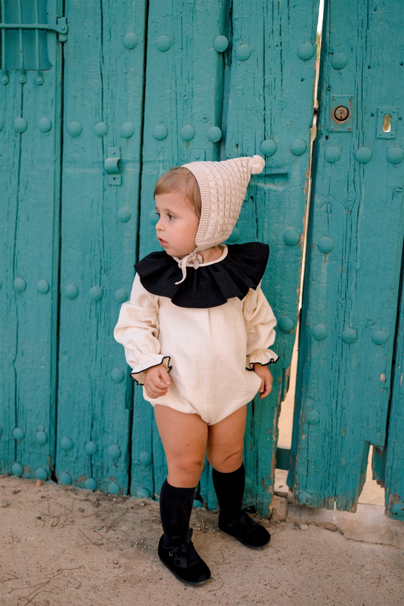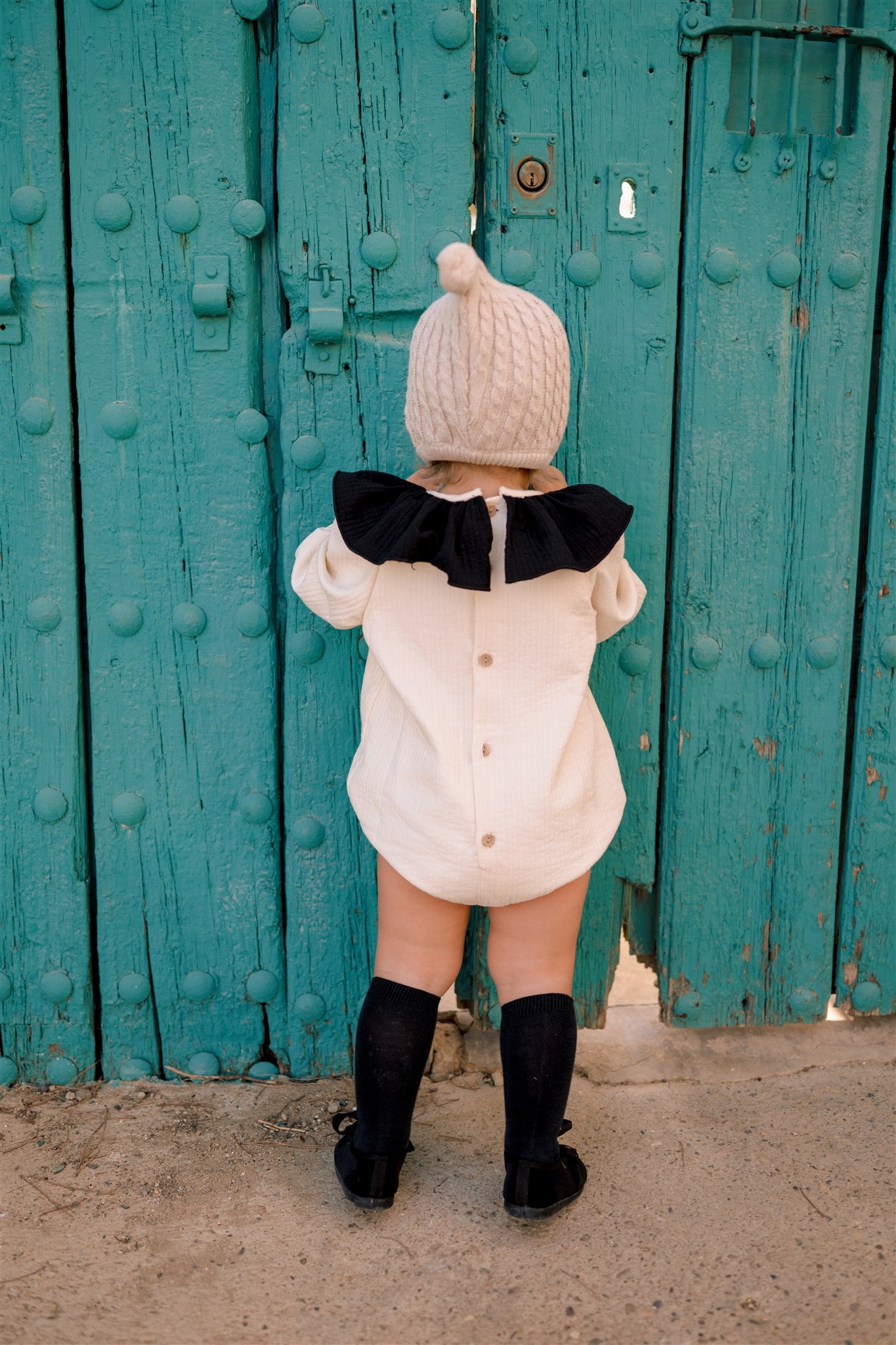 Pelele confeccionado en tejido 100% algodón en color crudo con cuello negro.