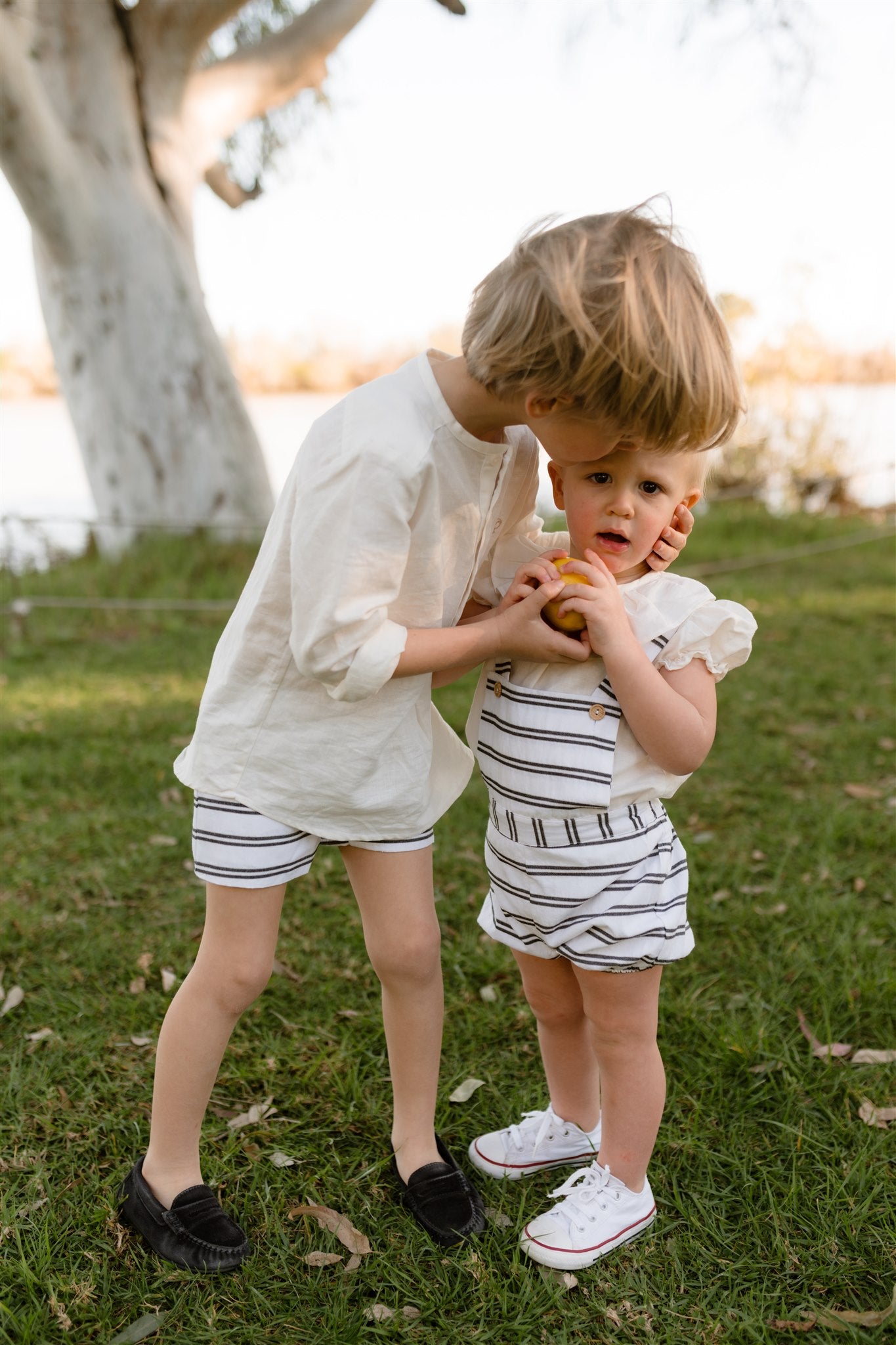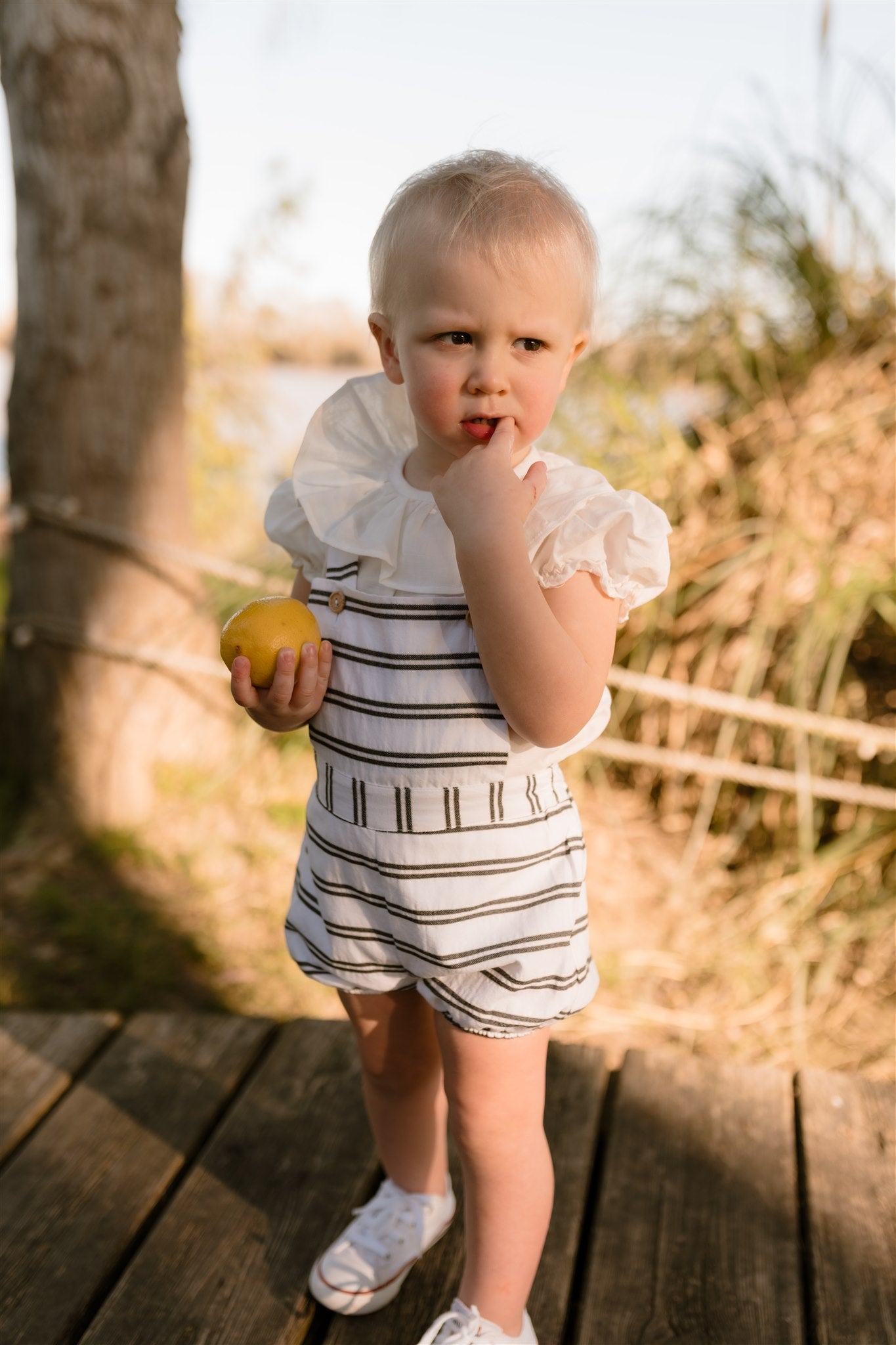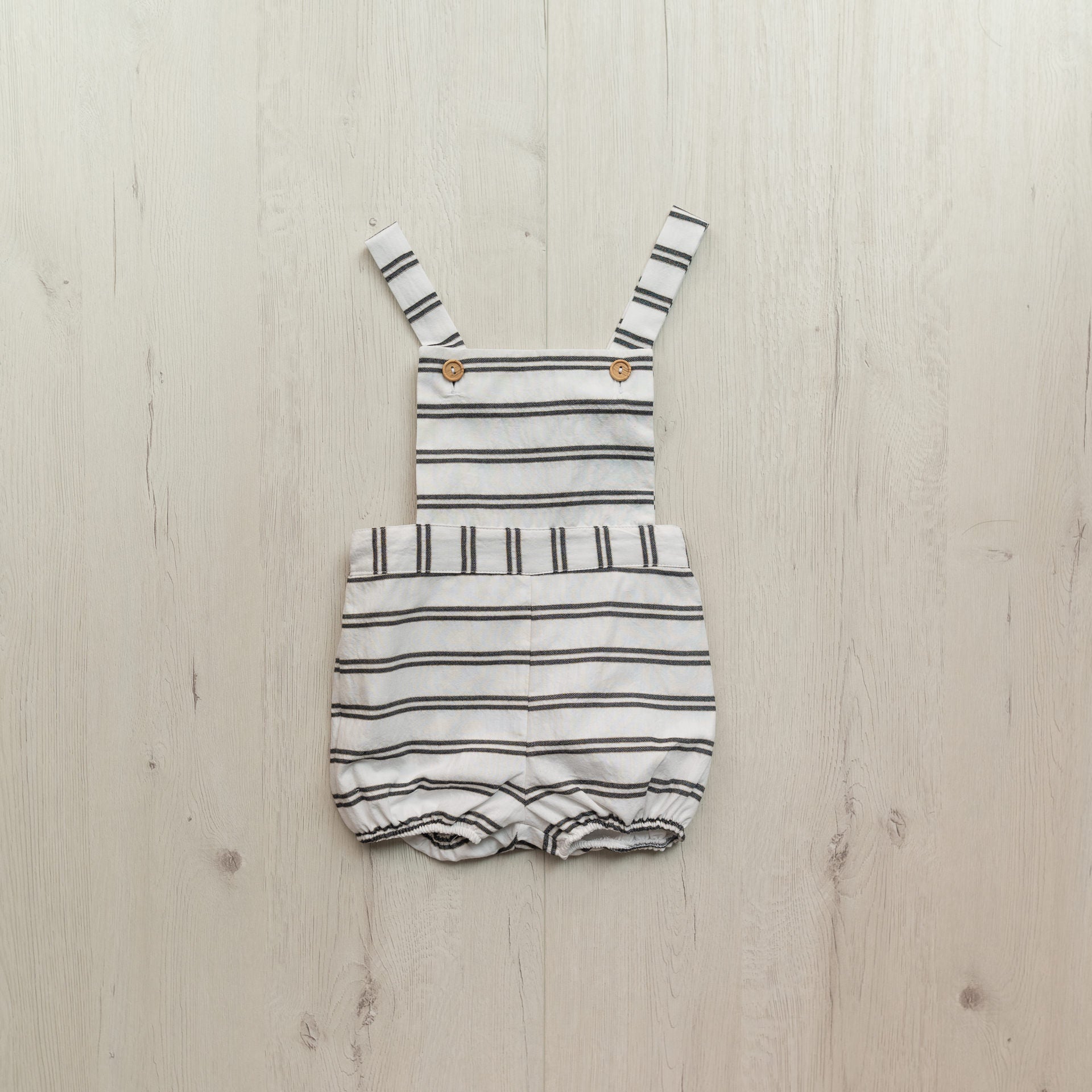 El petito está confeccionado en tejido 100% algodón y tiene un estampado en rayas negro y crudo. Es una prenda muy crecedera gracias a sus tirantes abotonados y sus elásticos en los muslos y cintura.
