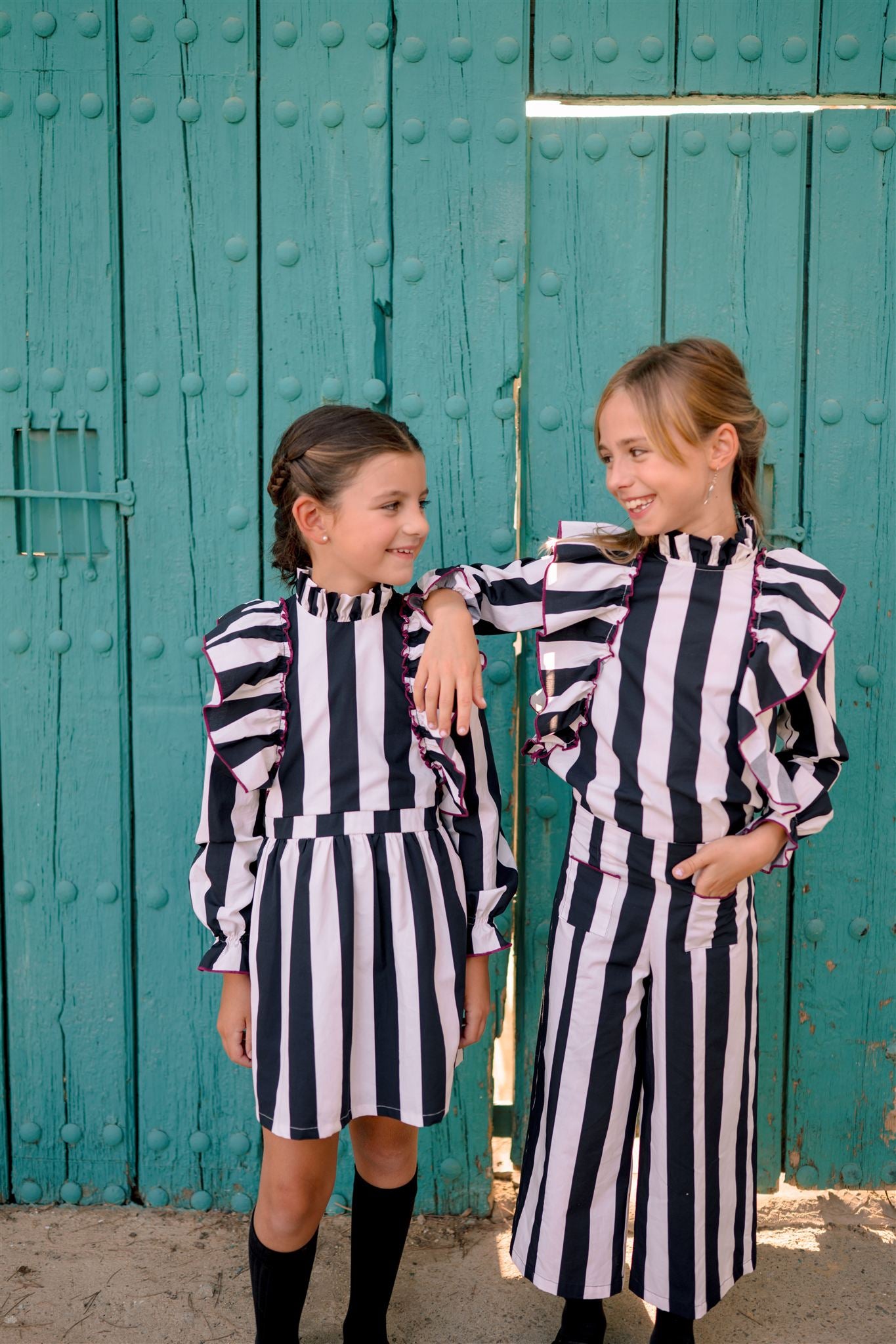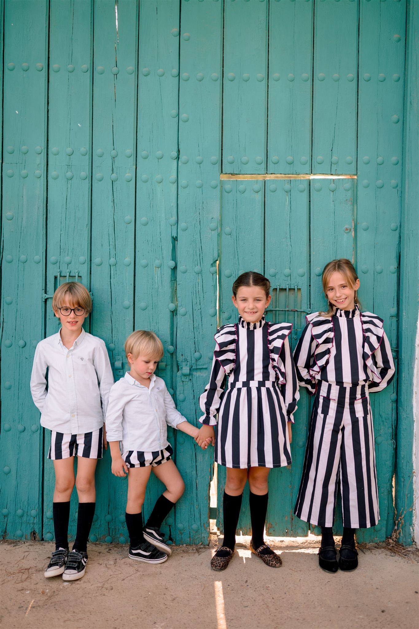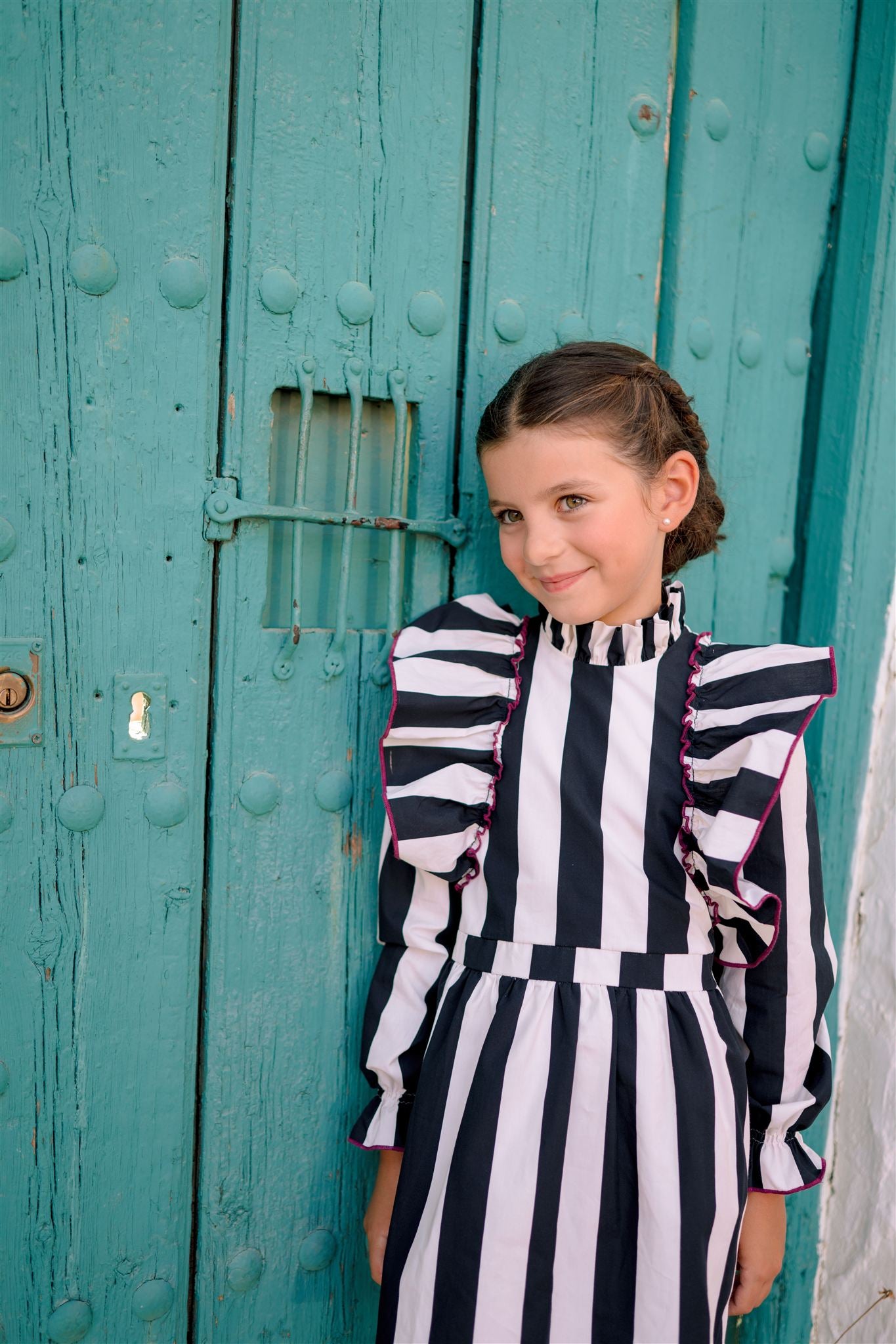 El vestido abotona por la espalda y tiene corte con elástico en la cintura. Va completamente forrado y dispone de prendas compañeras para conjuntar hermanos, incluso camisa para las mamás.