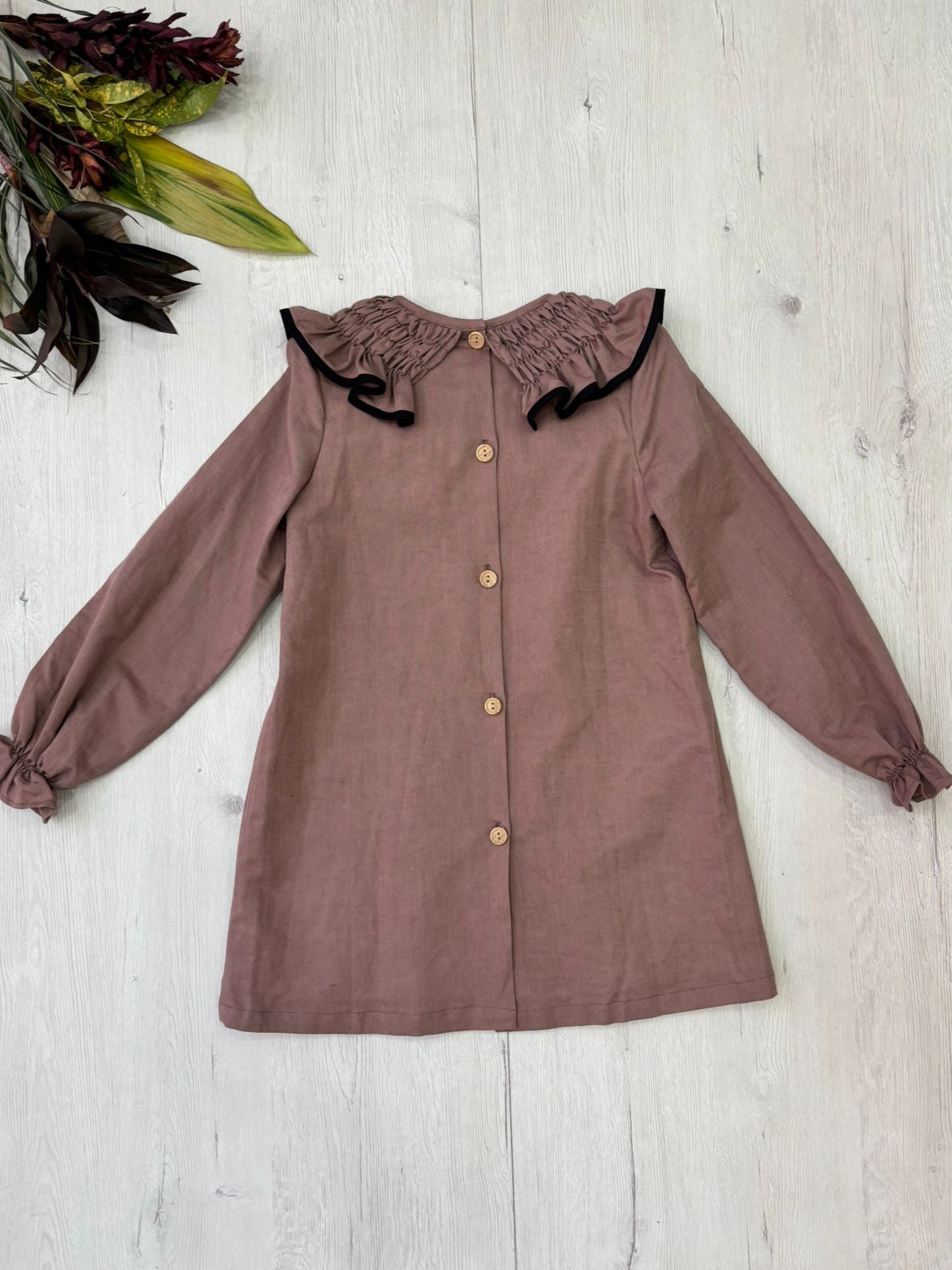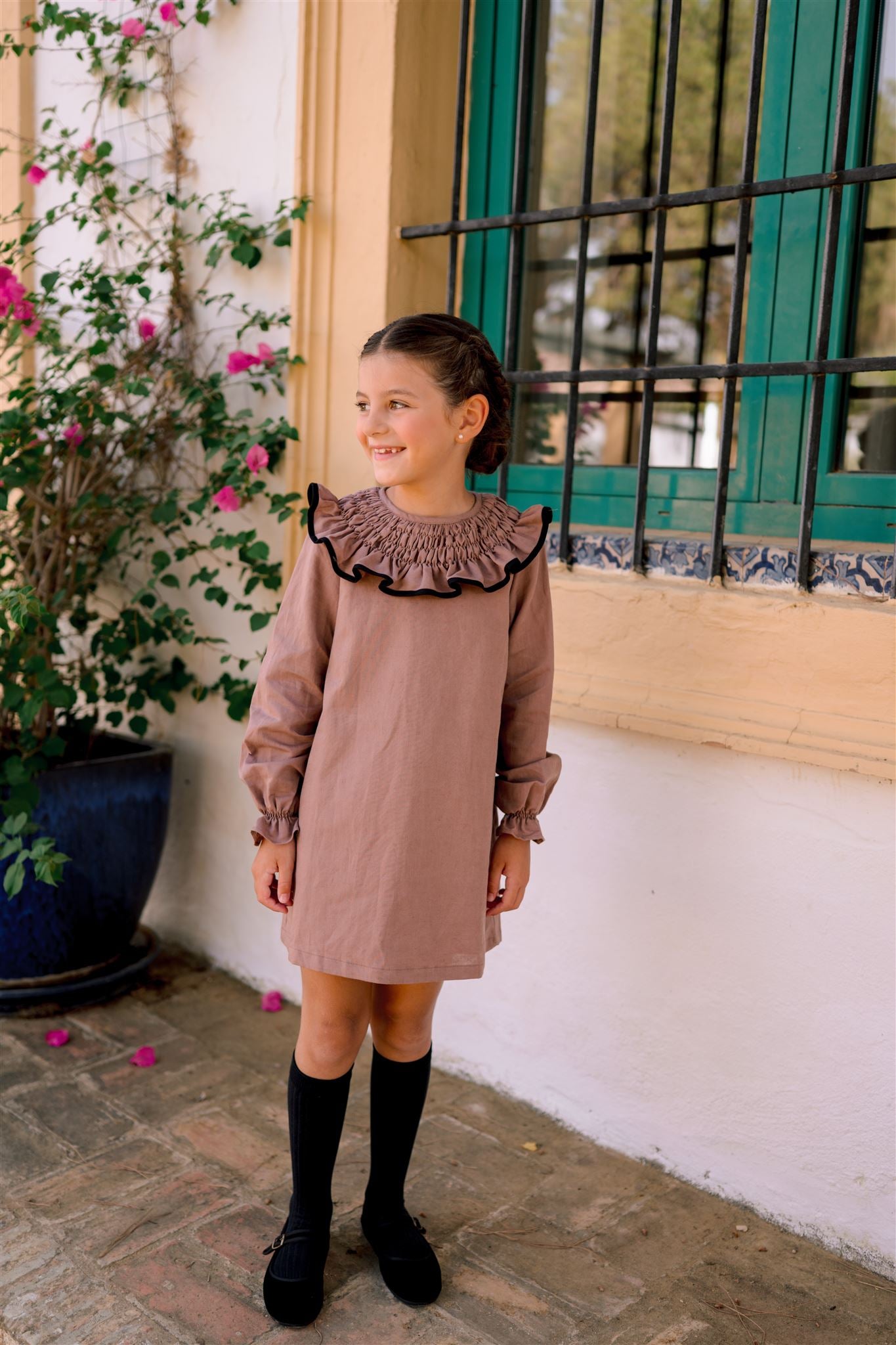 El vestido de niña Tamarindo es un diseño exclusivo de ILÓ-LILÓ confeccionado en lino (55%) y algodón (45%). El cuello que le da ese toque tan especial es en nido de abeja terminado en un filito negro seña de identidad de la marca.